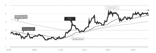 Bei Kursen um 5,26 Euro bildete sich nun eine Widerstandszone heraus, die zunächst noch überwunden werden will. Während die Rücksetzer und Konsolidierungsphasen weiterhin auf einem jeweils höheren Hoch enden und somit der Aufwärtstrend aus technischer Sicht intakt ist, vermögen es die Aufwärtsschübe bislang nicht, die TUI-Aktie über die Marke von 5,26 zu heben.