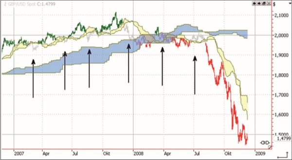 Der Ichimoku Trader wartete 2007 zunächst auf Long-Einstiege. Diese wurden zwar sicherlich nicht alle zum Gewinn, dafür entstanden aber auch nur wenige Fehl-Trades; man stellte sich mit dieser Methode nicht gegen den Markttrend und schwenkte nicht unmotiviert bei jedem kleinen Rückschlag auf Short. Ab Juli 2008 sah die Lage dann anders aus und die Richtung des Marktes war ganz klar Short. Wiederum hätten Sie es in dieser Phase mit Long Trades deutlich schwerer gehabt. Und die stabilste Performance entsteht meist dann, wenn man sein Glück nicht zu stark herausfordert.