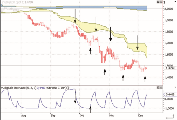 Bisher haben wir den Markt nur hinsichtlich seiner Trendstärke und Trendrichtung untersucht. Wir haben jene Marktphasen, die sowohl am Wochen-Chart als auch am TagesChart einen ausreichend starken Trend in dieselbe Richtung aufweisen, zum nachfolgenden Trading freigegeben. Wir müssen jetzt nur noch mit Hilfe einer für Trendmärkte geeigneten Trading-Technik nach konkreten Ein- und Ausstiegen suchen. Hierfür möchte ich die digitale Stochastik verwenden.
